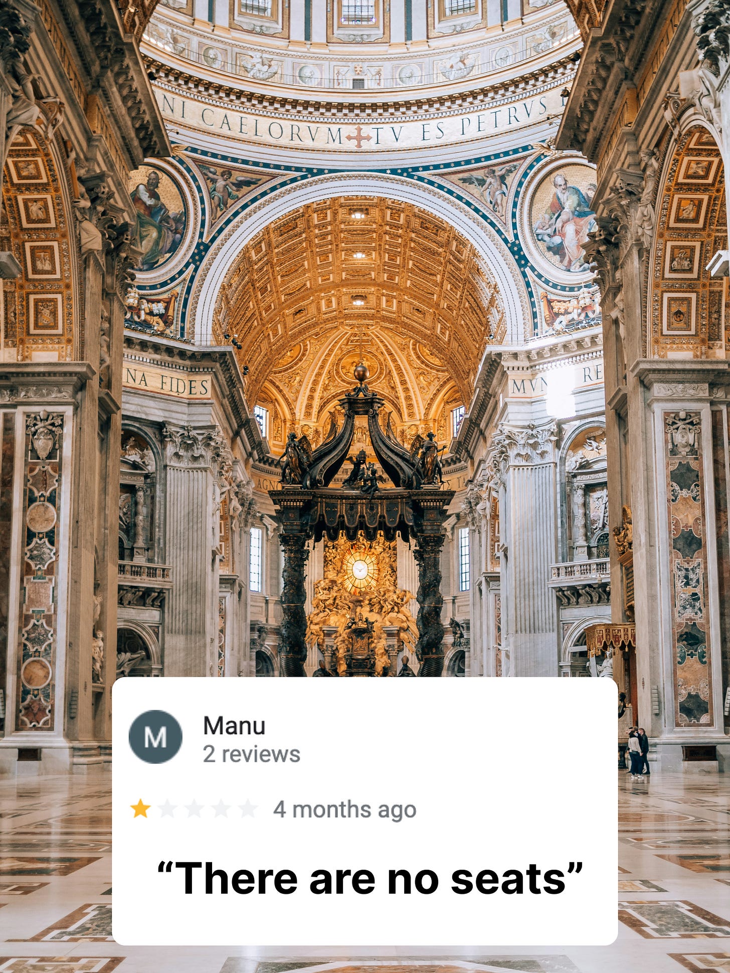 Says “Manu”, who visited St Peter’s Basilica - the largest church in the world, designed by Michelangelo - and delivered a crushing blow to the so-called “attraction,” its architect, and presumably God himself in the form of a one-star review.